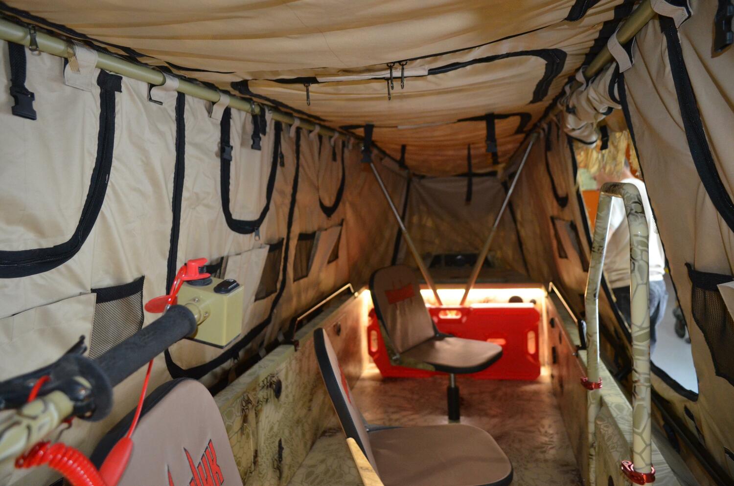 Для хранения и транспортировки лодки-болотохода "Хищник" компанией PND-CUSTOM разработан специальный тент из непромокаемого материала, который обеспечивает защитную оболочку, предохраняя лодку от неблагоприятных погодных условий, таких как дождь, снег, пыль и грязь. Такой тент гарантирует сохранность лодки при длительных стоянках на открытом воздухе, ведь без надлежащей защиты срок службы лодки сокращается.